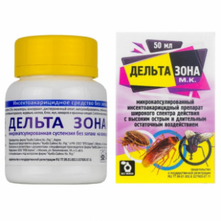 Инсектоакарицидное средство "Дельта Зона м.к." - это микрокапсулированная суспензия в виде вязкой опалесцирующей жидкости белого цвета без запаха. Содержит в качестве действующего вещества (ДВ) пиретроид дельтаметрин (2,5%), а также эмульгаторы, консервант, дисперсионный агент, каисулообразователь, стабилизатор, отдушку и растворитель (вода).